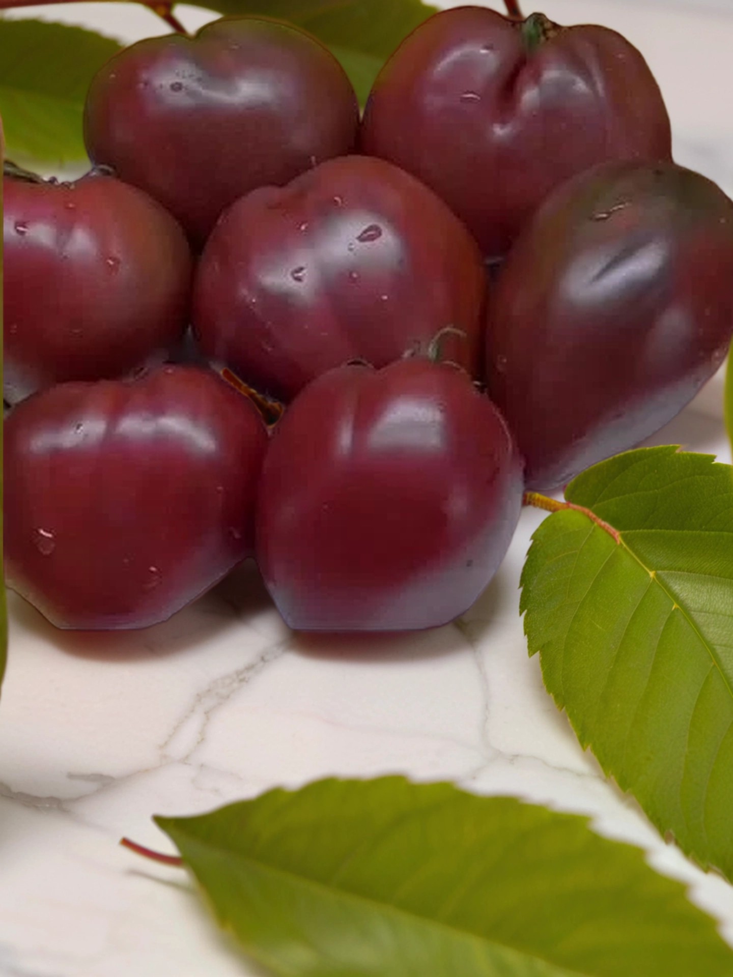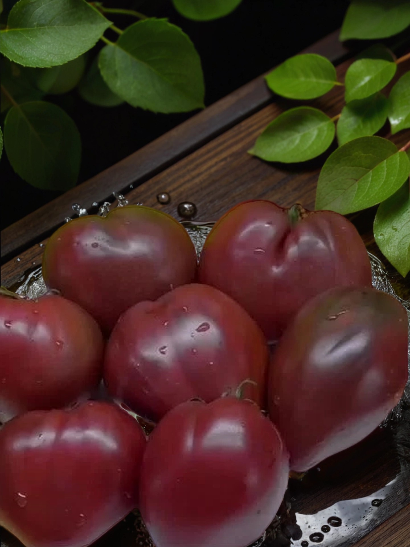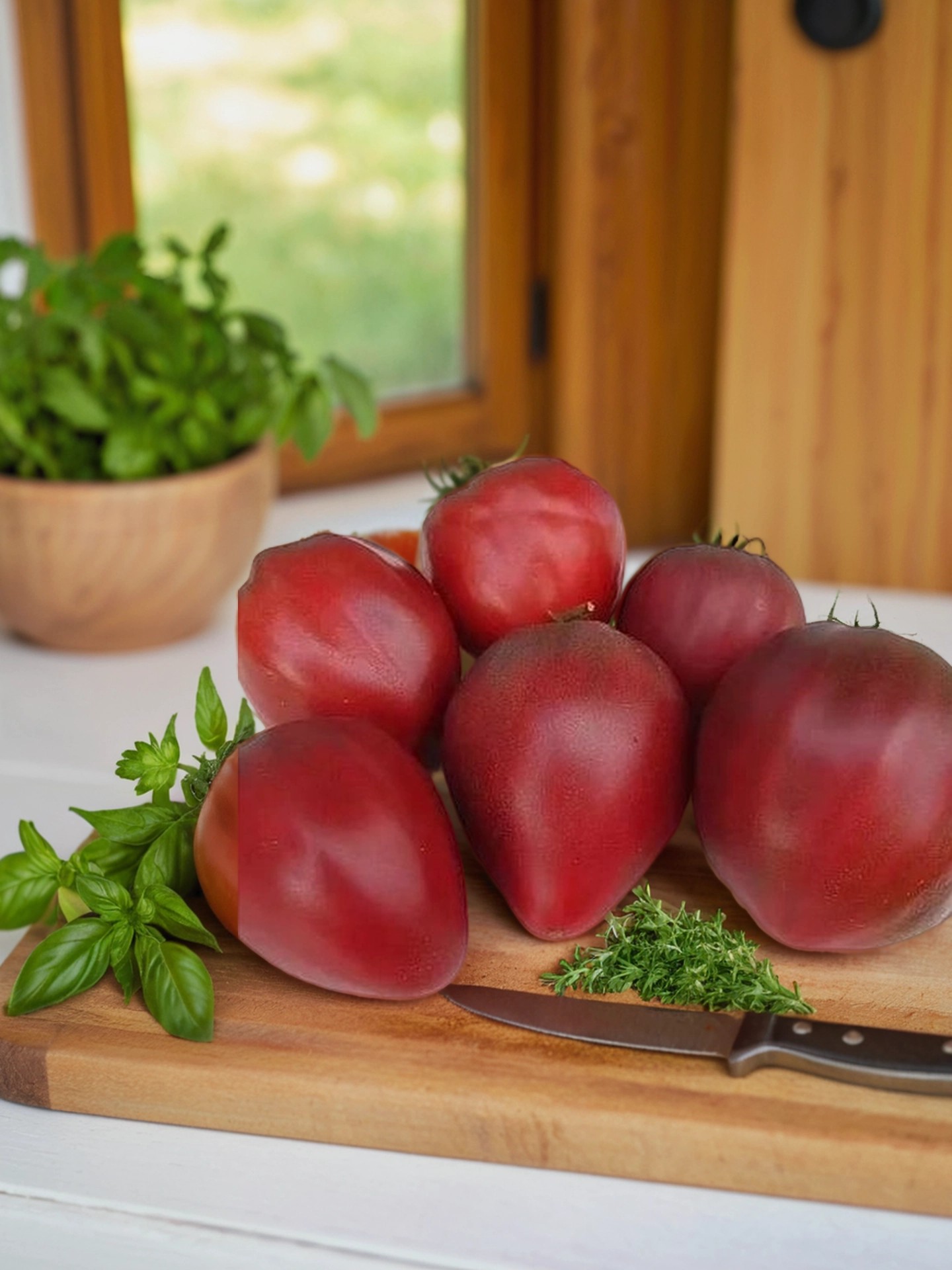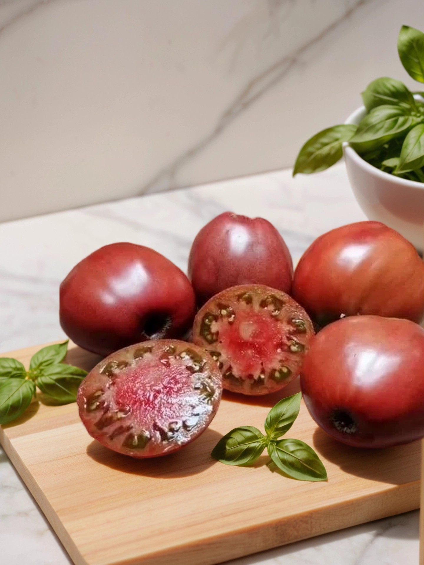 Плоды — тупые сердцевидные, бордово-коричневые внутри с темно-бордовым оттенком, имеют мягкую мясистую структуру и сладкий, насыщенный вкус. На разрезе заметна сахаристость, а вес плодов варьируется от 250 до 500 г, с первыми плодами достигающими 800 г. Идеальны для салатов и свежих блюд, добавляя яркий цвет и насыщенный вкус.