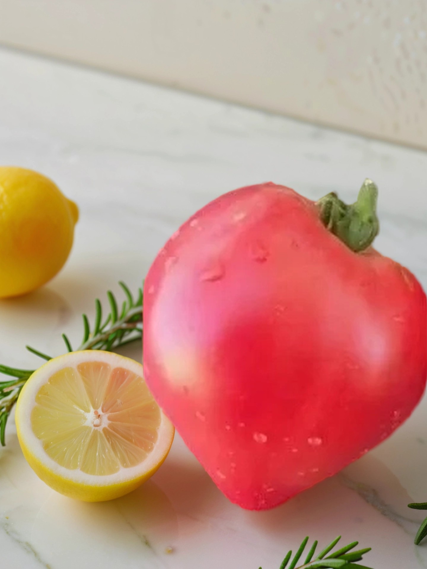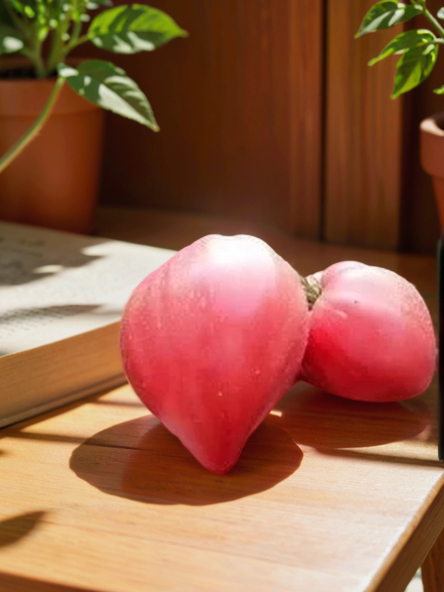 Плоды — ярко-жемчужно-розовые, с гладкой кожицей и сердцевидной формой, встречаются широкие сдвоенные и вытянутые с носиком. Вес каждого — 300-400 г, а помидоры выровнены по всей высоте куста, без мелочей. Мякоть плотная, сочная, с минимумом семян.