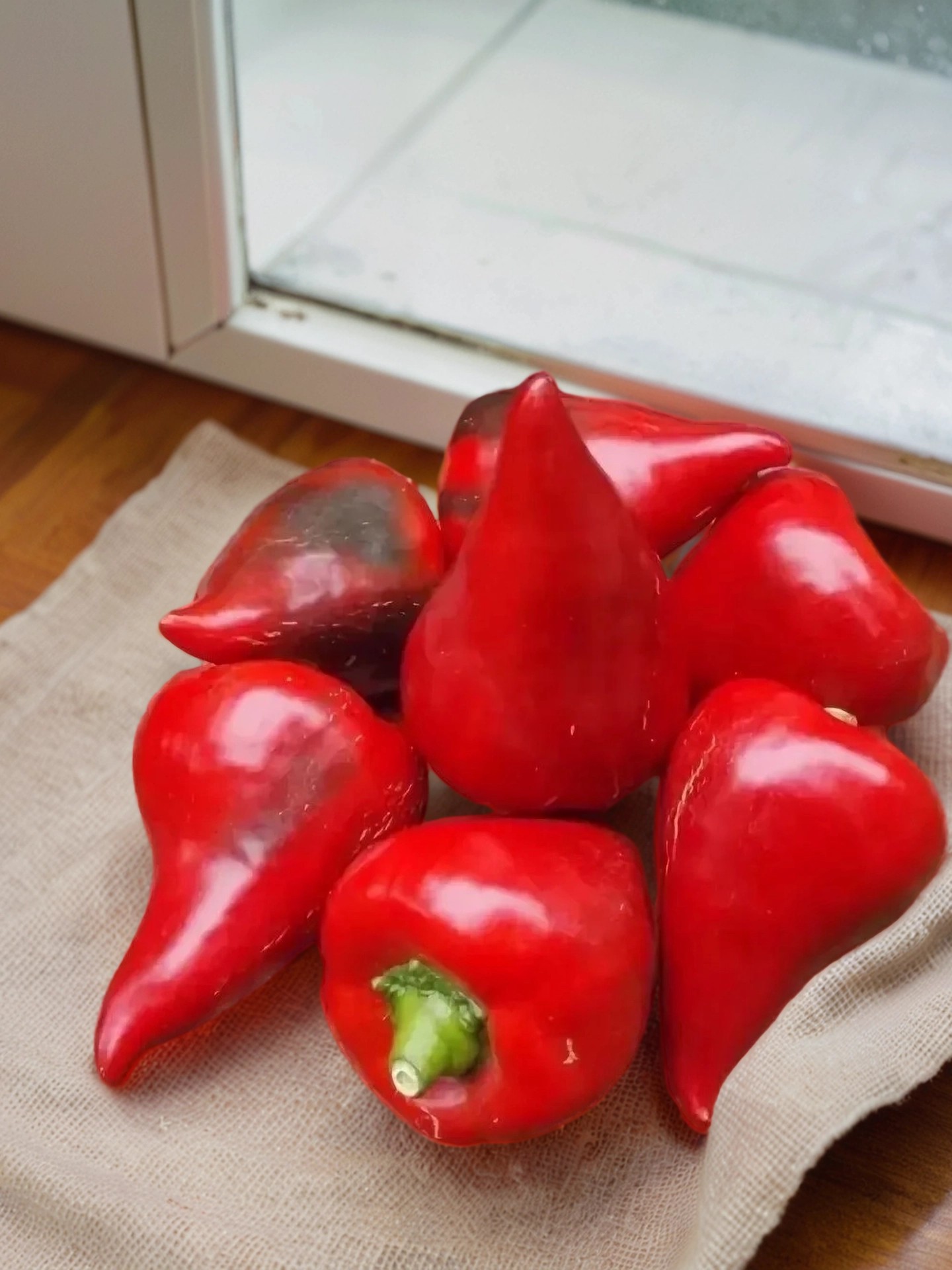 Куст — компактный, раскидистый, высотой до 40–60 см, с гибкими тонкими стеблями. Плоды — оригинальной формы, напоминающие луковки с заостренным кончиком и сердцевидной структурой в разрезе. Их ярко-красная кожура с глубокими сгущениями до черного-красного цвета и лаковым блеском делает их очень эффектными. Размер — до 10 см в длину и ширину, вес — до 160 г, что больше, чем у многих других крупноплодных сортов. Толстые стенки — 8–10 мм, иногда до 1,5 см, а плотная, сочная мякоть отлично держит форму и долго сохраняет свежесть — до 7 недель в холодильнике.