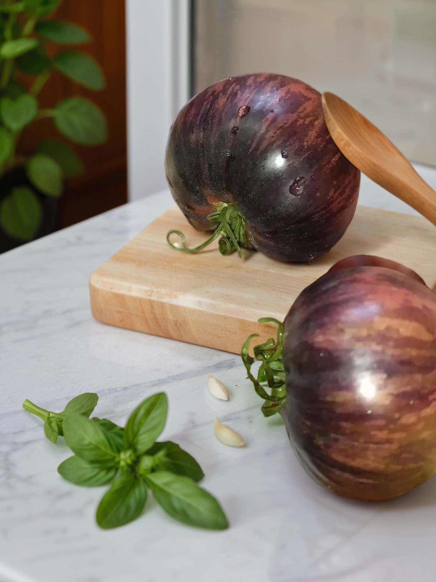 Куст — мощный, достигает высоты 150–200 см, требует формирования и поддержки для максимальной урожайности. Плоды — плоскоокруглые, весом от 250 до 500 г, с уникальной окраской: почти черные с множеством разноцветных штрихов и полосок, что делает их настоящим украшением любого блюда.