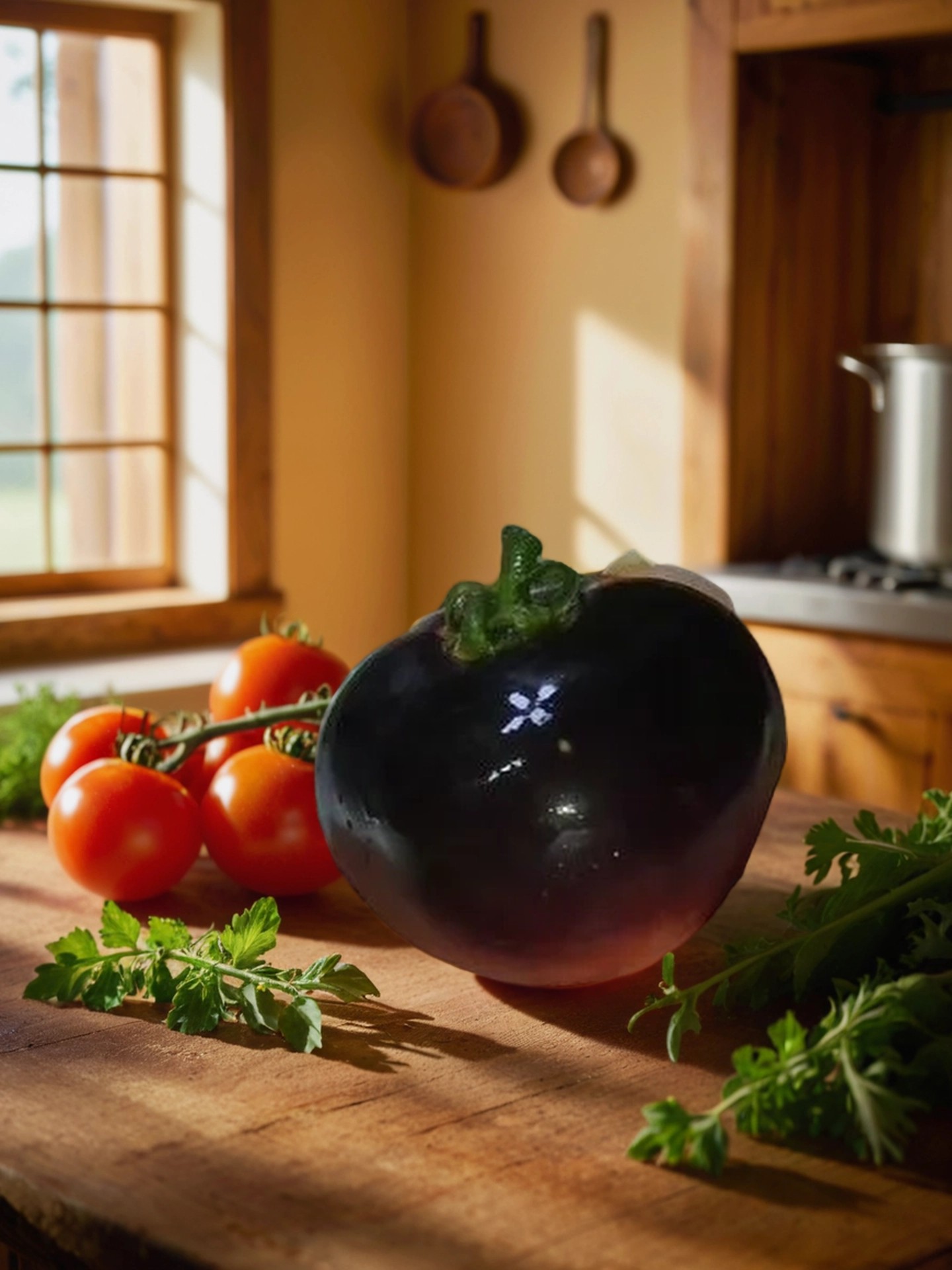 Познакомьтесь с томатом с плоскоокруглой формой и ярким необычным цветом — от зеленого с темными пятнами до насыщенно-фиолетово-красного при полном созревании. Вес плодов — от 160 до 190 г, с 3–4 камерами внутри, что обеспечивает их сочность и мясистость.