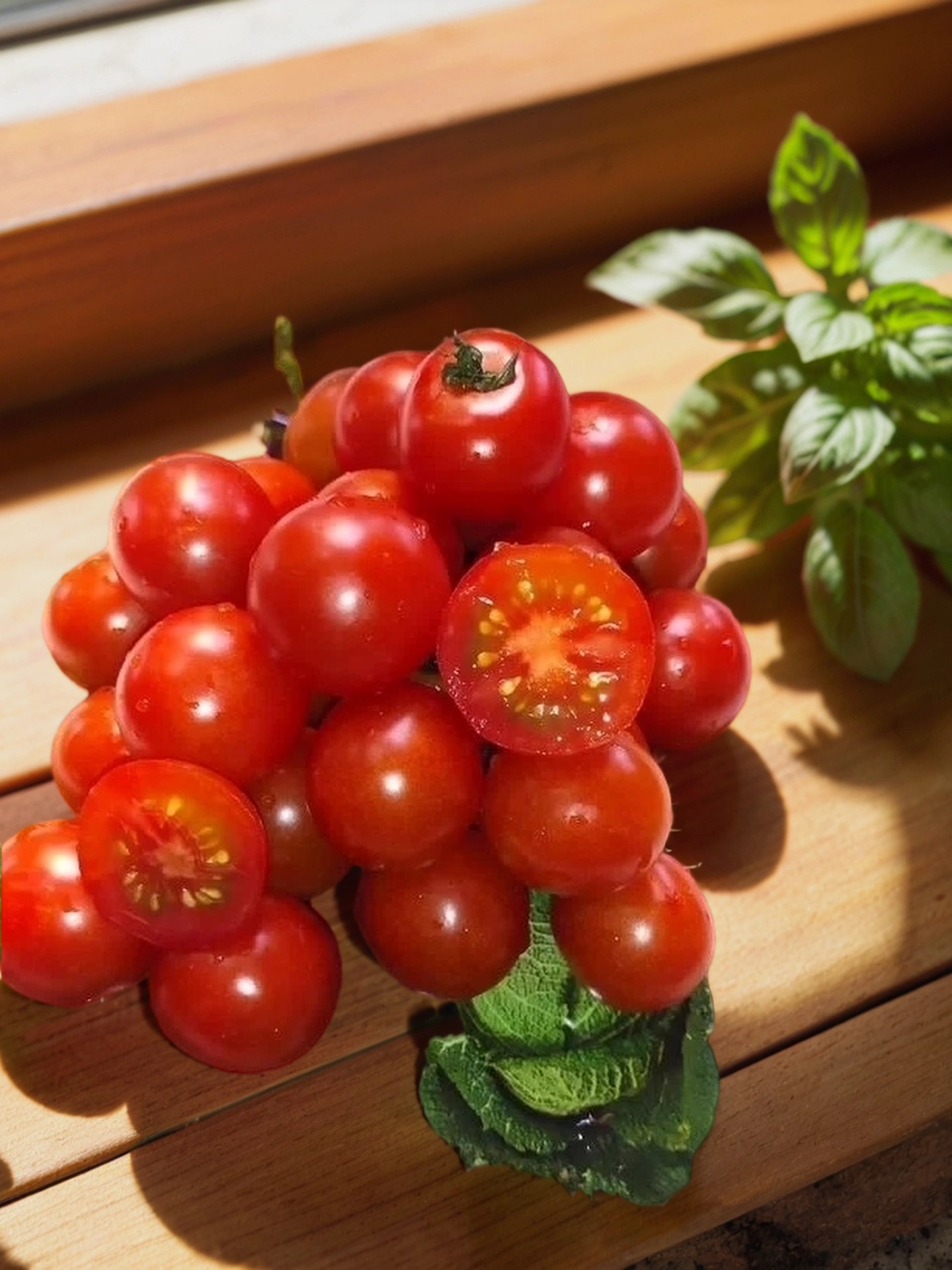 Куст — крепкий, весь в ярких кистях, которые выглядят очень нарядно и эффектно. Нижние кисти — простые, с до 9 плодами, а верхние — с до 30, создавая живописную картину на растении. Плоды — округлые, плотные, мясистые, весом 20–30 г, насыщенного тёмно-красного цвета. Вкус — сладкий, насыщенный, с ярким ароматом, идеально подходящий для свежего потребления.