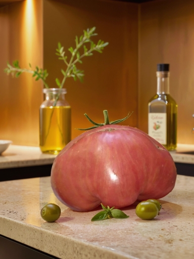 Плоды — крупные, весом до килограмма и более, в виде широких сердечек-лодочек, с ярко-оранжево-розовой окраской и красными полосками, создающими эффектный внешний вид. На нижних кистях — гиганты, достигающие 1 кг, а по мере роста — крупнее и больше. В верхних кистях — плоды весом 250–300 г, плотные, мясистые и сахаристые, идеально подходящие для пасты, соусов, соков, заморозки и нарезки слайсами для бутербродов. Они не растекаются и не разваливаются, оставаясь привлекательными и сочными.