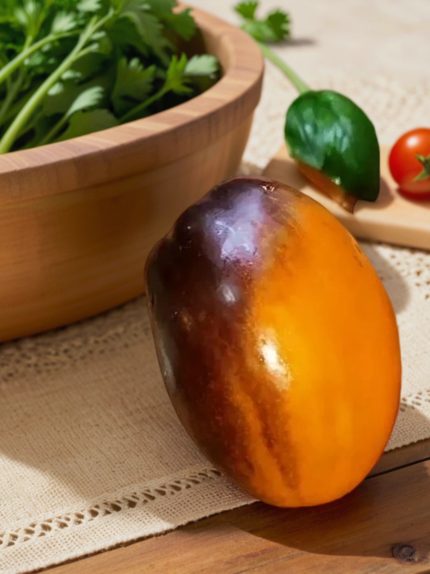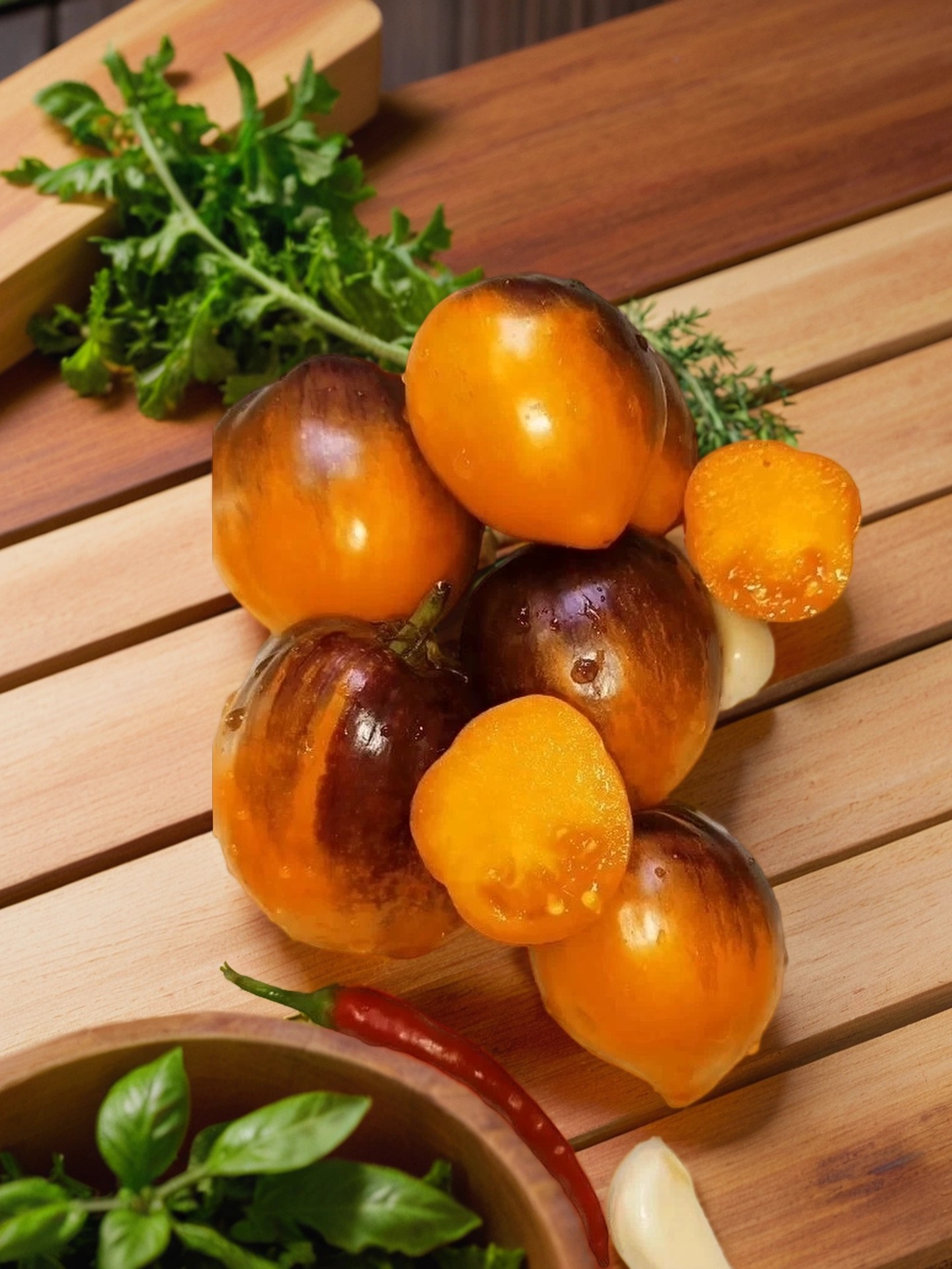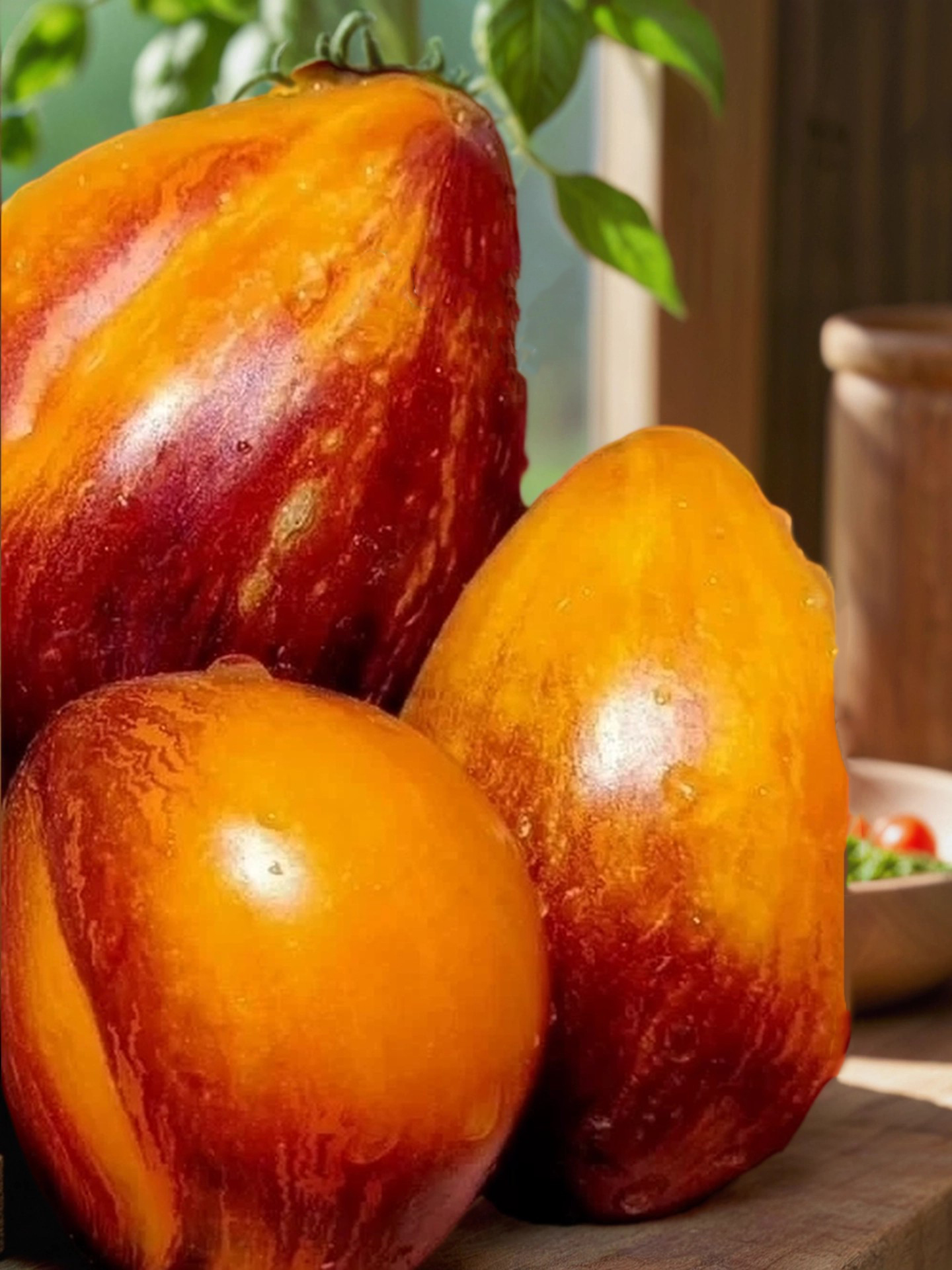 На ранних стадиях созревания он имел нежный медовый оттенок, а мякоть — сочную, плотную, карамельного цвета с мраморной текстурой. Вкус — фруктовая кислинка в гармонии с взрывными сахарами. Когда томат полностью созрел, его яркая рыжая палитра раскрылась полностью, а вкус преобразился: мякоть стала похожа на манго, маслянистая и с нотками железа, а кислинка исчезла, уступив место медово-сахарной карамели. Сока — невероятное количество, что делает его особенно вкусным и сочным.