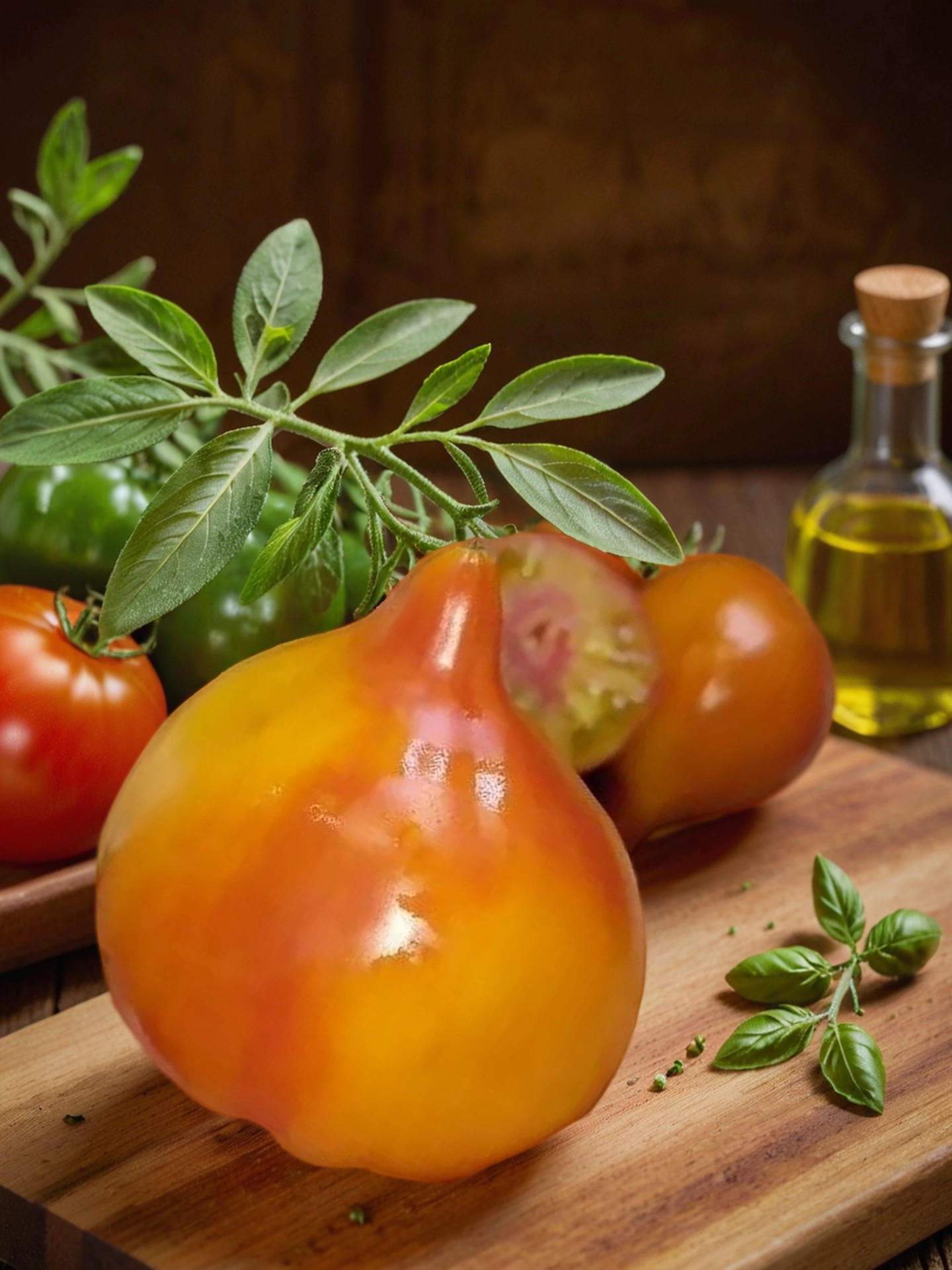 Плоды — небольшие, весом около 80–100 г, с нежнейшей мякотью, которая напоминает экзотический фрукт. Их вкус — сладкий, насыщенный и деликатесный, идеально подходящий для свежих салатов, закусок и изысканных блюд. Благодаря своему оригинальному виду и превосходному вкусу, этот сорт считается деликатесом и украшением любой коллекции.