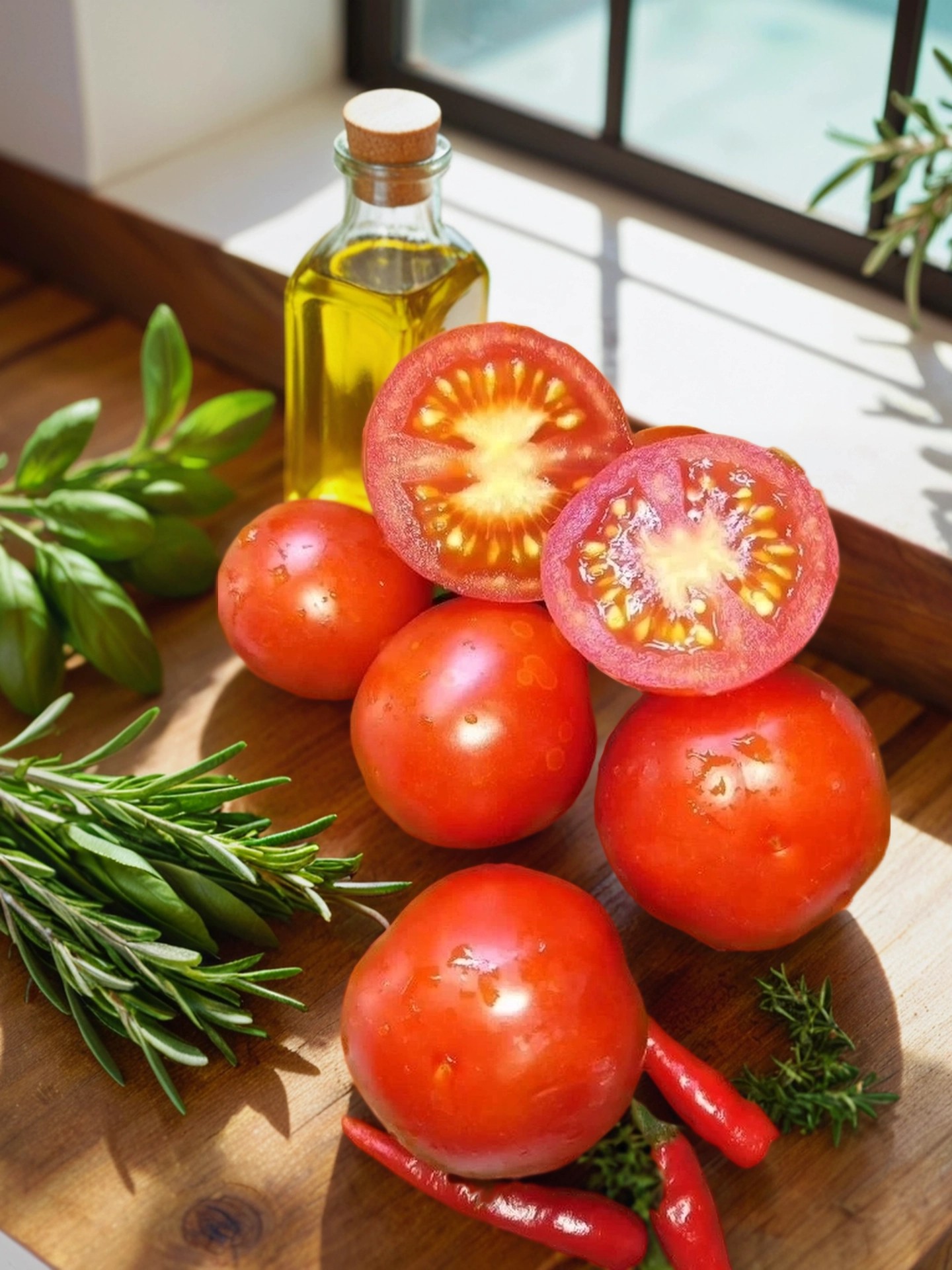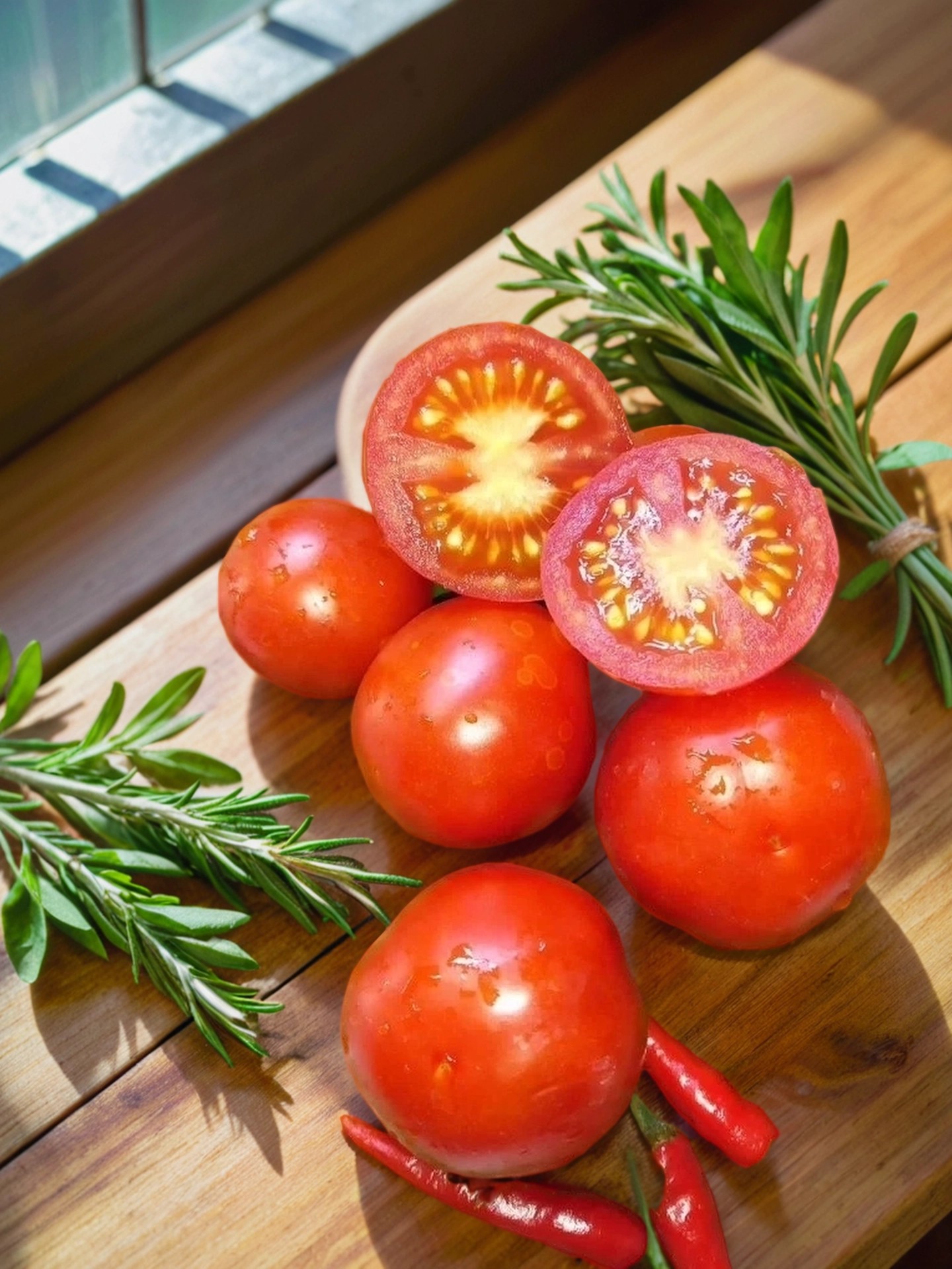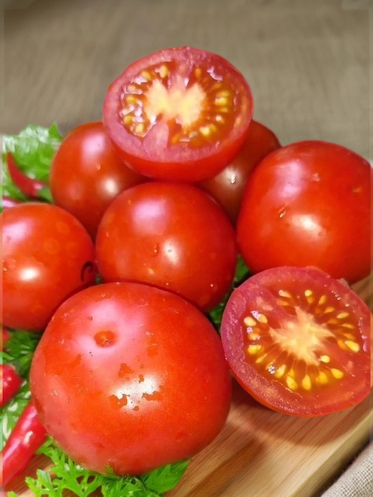 Плоды — крупные для сорта, весом 80–100 г, округлой формы с 4–6 камерами. В стадии незрелости — светло-зеленые с маленьким пятном у основания, а в зрелом — ярко-красные. Их отличает насыщенный, сбалансированный вкус с приятной сладостью и ярким томатным ароматом. Мякоть — сочная, многосемянная, что придает плодам дополнительную сочность и аромат.