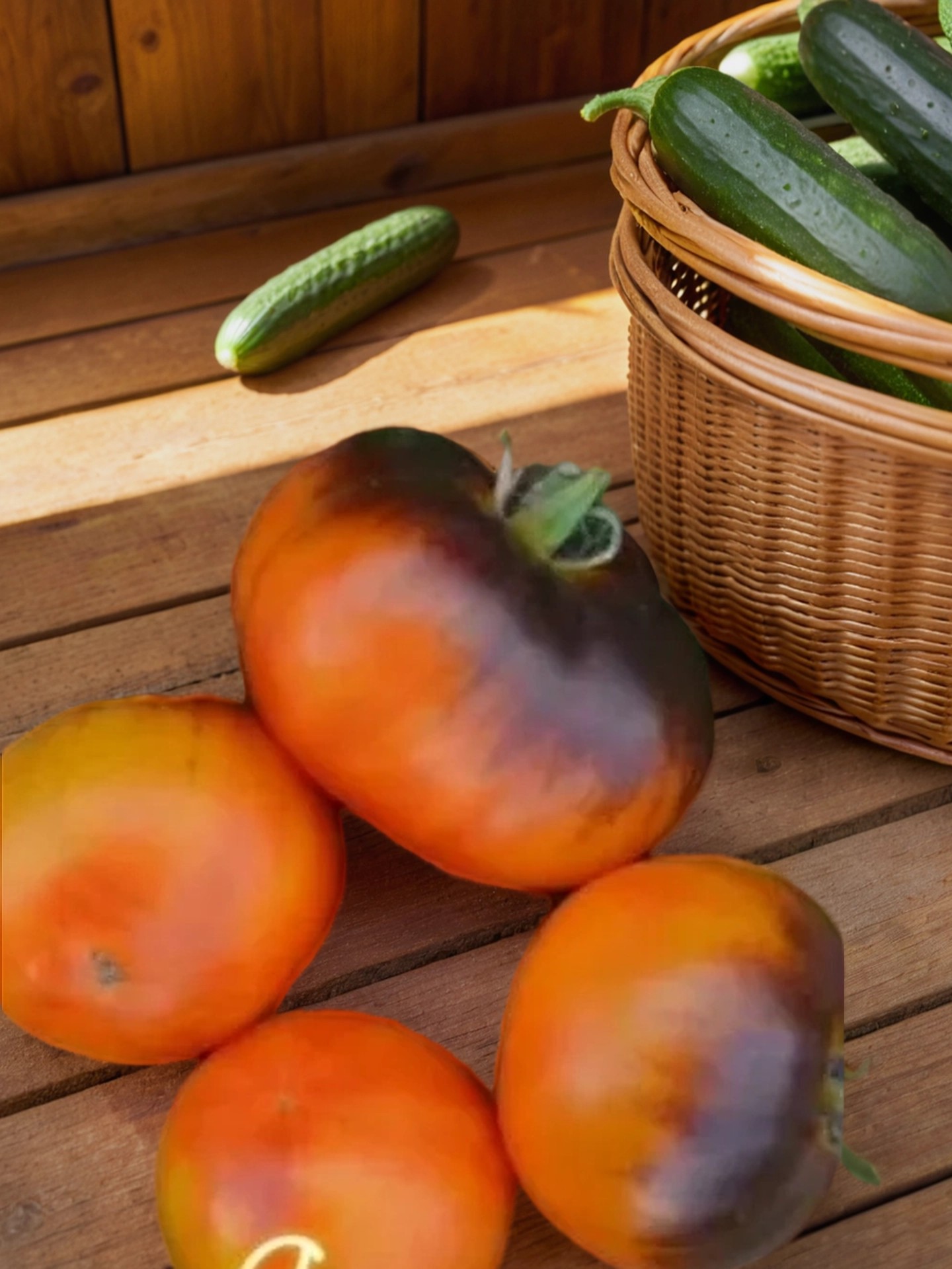 Плоды — плоскоокруглые, среднекрупные, весом 150–200 г, ребристые, с яркой окраской: незрелые — светло-зеленые со штрихами, полностью созревшие — насыщенно-оранжево-желтые с пятнами антоциана сверху. Внутри — многокамерные, мясистые, с насыщенной желто-оранжевой мякотью и красным центром, что придает им особый внешний вид и вкус. В одной кисти — до 3 плодов.